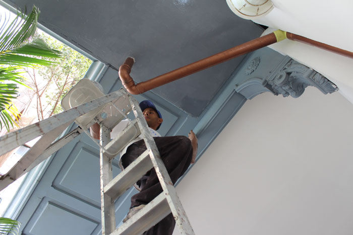 Por tratarse de una casa colonial con características patrimoniales, posee una estructura que debe ser tratada con sumo cuidado. La casa presentaba serios daños de humedad y filtración en fachada, techos y paredes, internas y externas, producidas tanto por el nivel freático del suelo, como por la humedad transmitida debido a los daños del drenaje y la falta de protección contra la lluvia de la edificación contigua. Eso conllevó a la corrección de las zonas afectadas y su posterior revestimiento con pintura en aceite, preparada según el código original. Corrección y sustitución de los drenajes, los centros-pisos y los cajetines incrustados en las paredes, los cuales se encontraban oxidados.